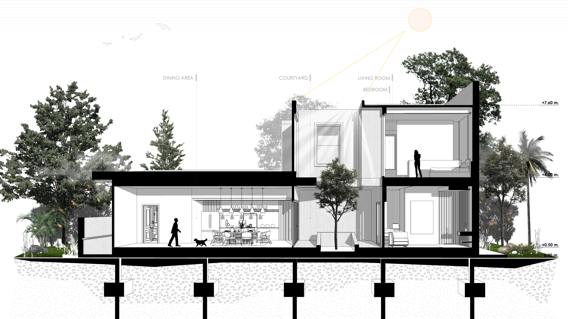 บ้านพักตากอากาศที่ถูกใช้เป็นที่ประชุม งานสังสรรค์ และรับรองแขก แต่ยังคงให้ความเป็นส่วนตัวกับผู้อาศัย ออกแบบ courtyard กั้นไว้ตรงกลางแยกพื้นที่ระหว่างส่วนรับประทานอาหารและส่วน private ซึ่งประกอบไปด้วยห้องนั่งเล่นที่ด้านบนชั้นสองคือห้องนอนขนาดพอดีเพียงพอต่อการใช้งานและเพื่อความเป็นส่วนตัวของเจ้าของบ้าน