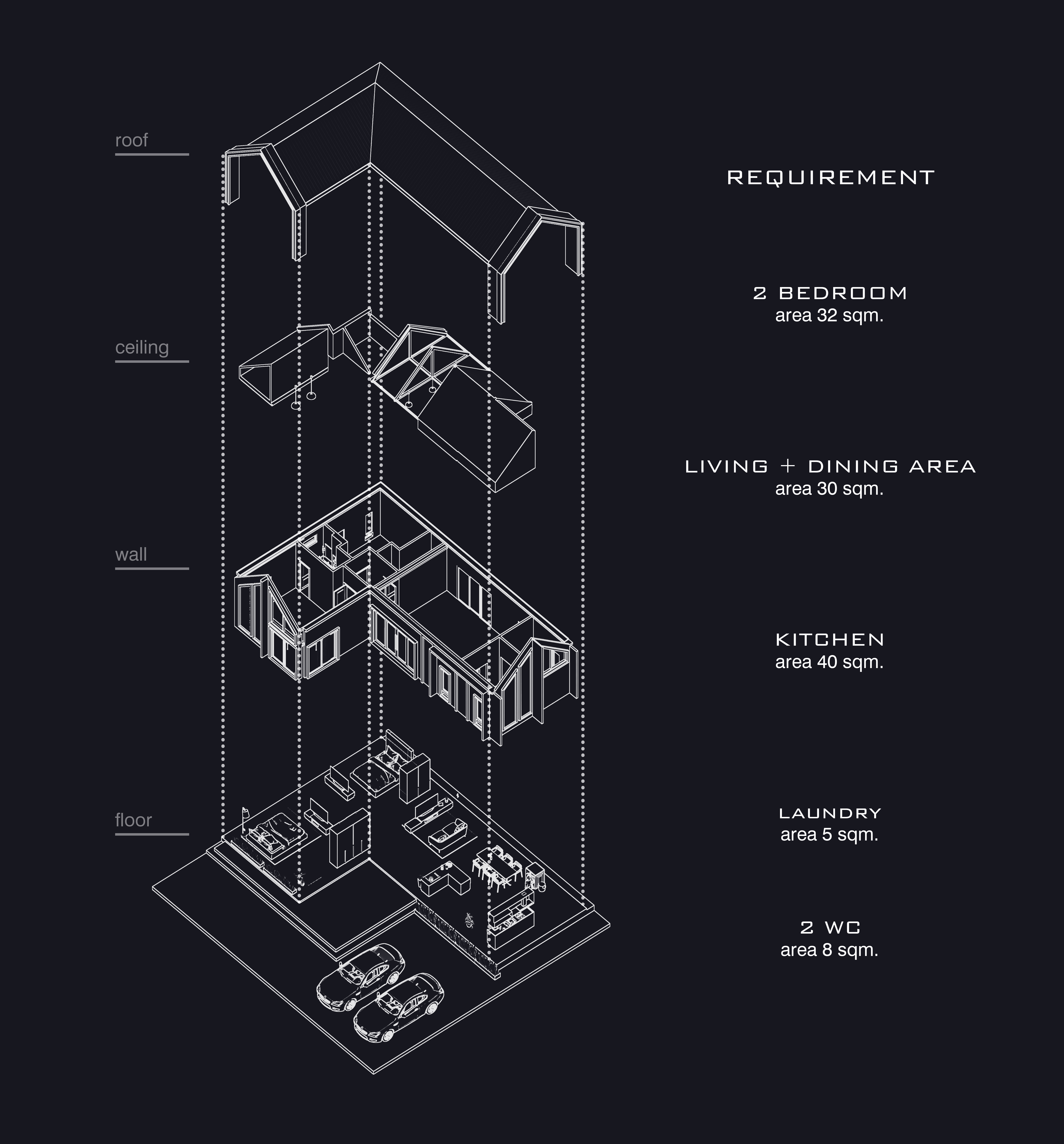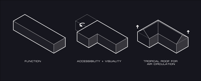 ออกแบบผังพื้นบ้านจัดวางเป็นรูปตัวแอล มีเฉลียงหน้าบ้านที่กว้างเพื่อรองรับกิจกรรมของคนในบ้าน และทำหน้าที่เป็นจุดเชื่อมระหว่างห้องนอนและห้องนั่งเล่น ที่มีส่วนของเคาท์เตอร์บาร์อยู่ภายใน