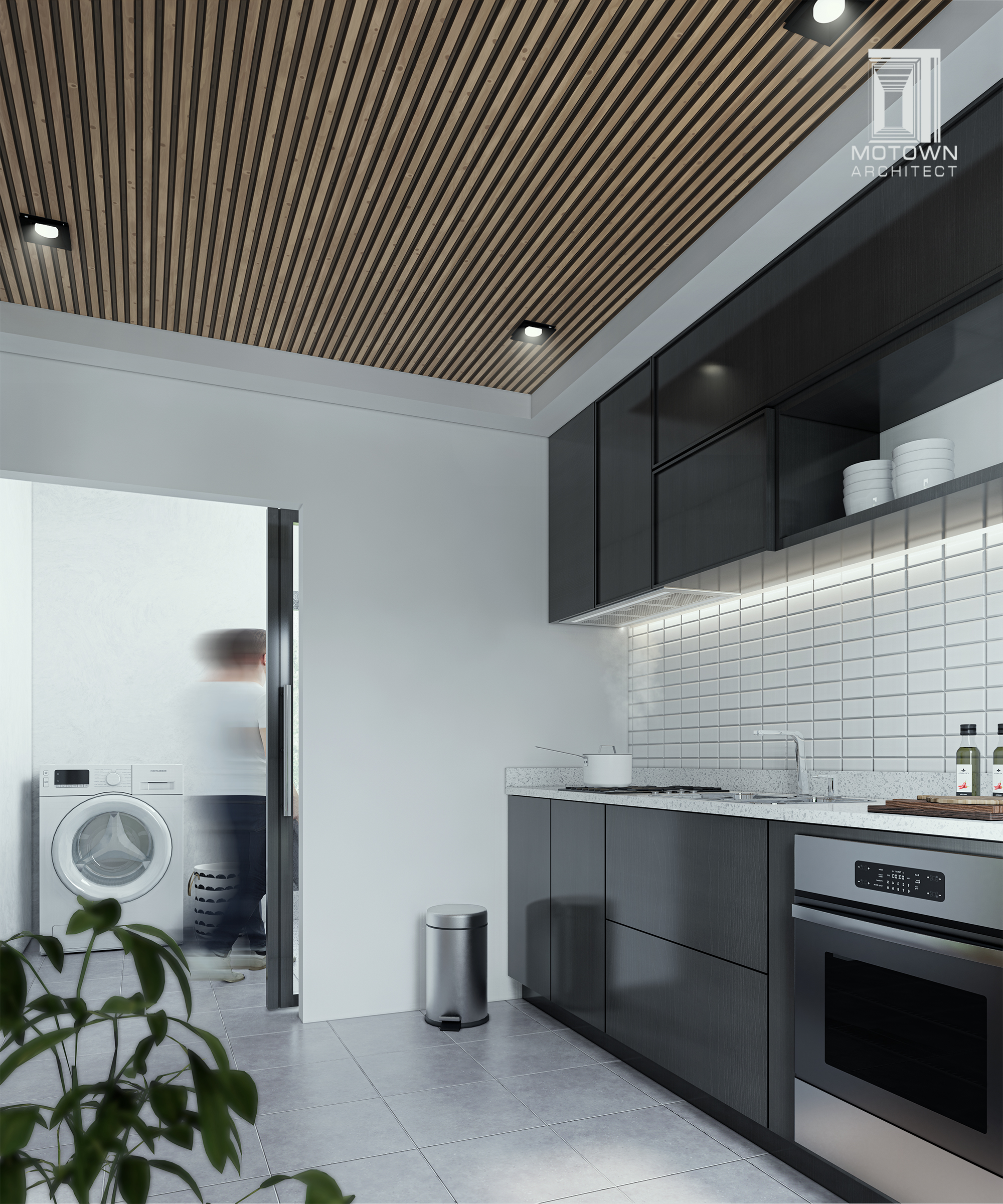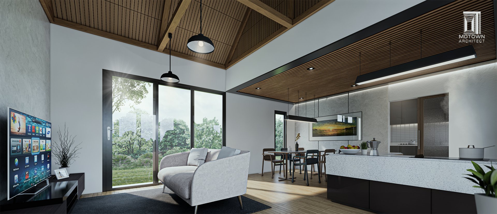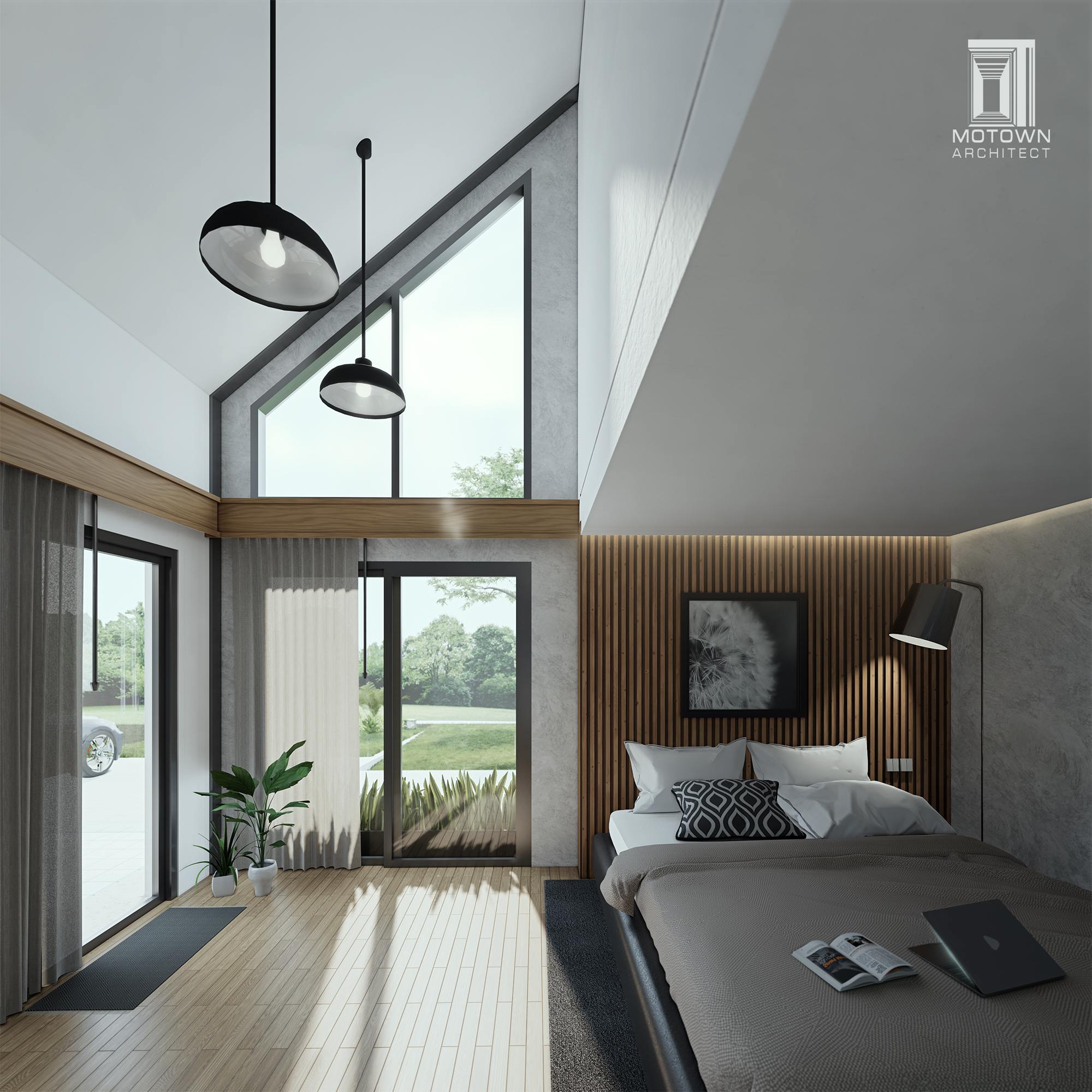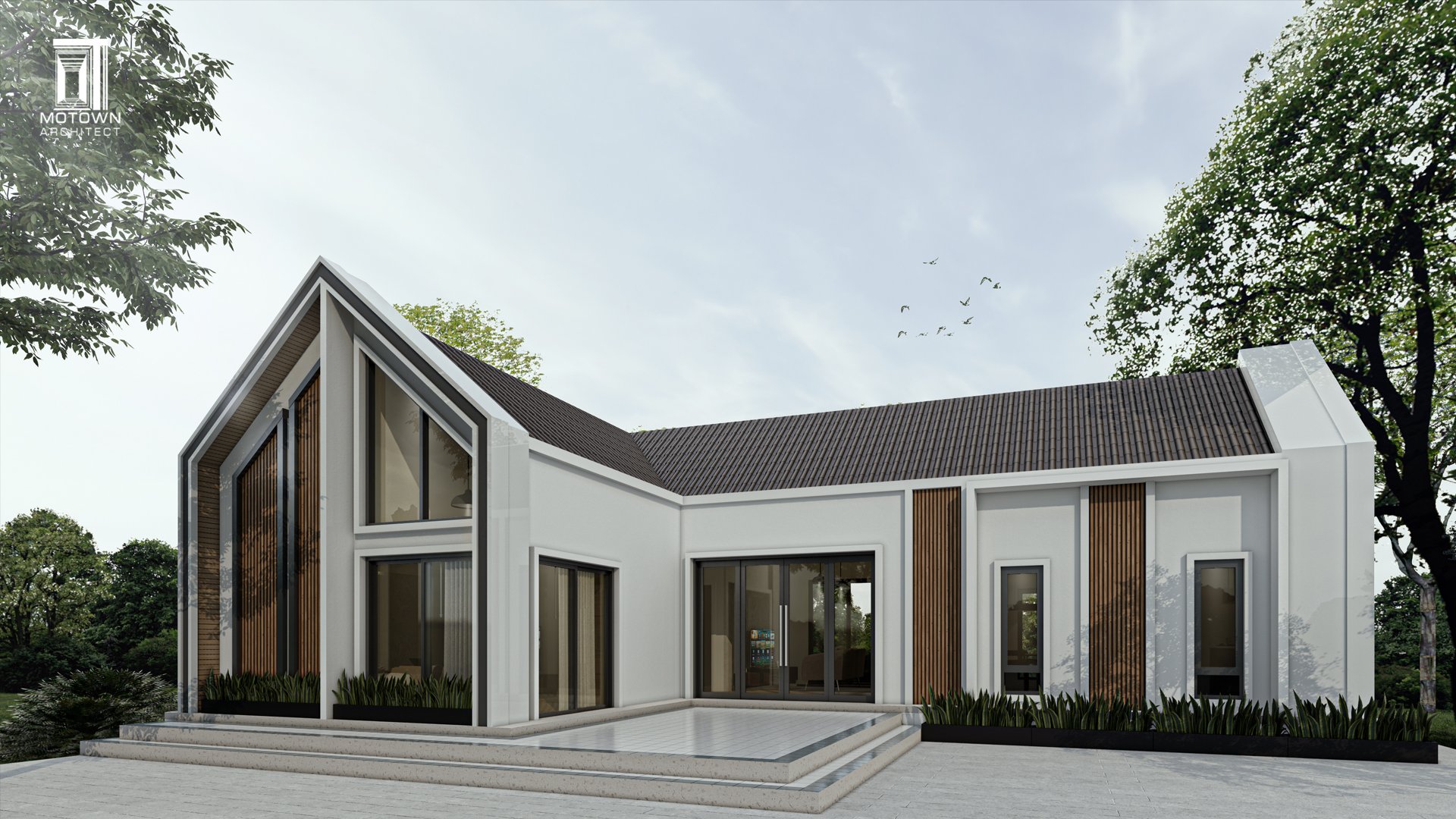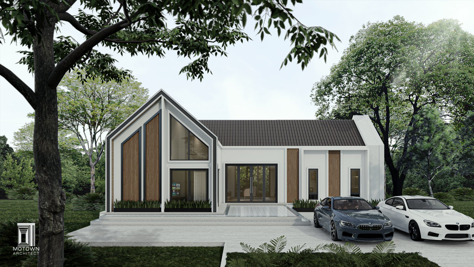 บ้านชั้นเดียวทรงจั่ว ออกแบบส่วนภายนอกบ้านด้วยผนังสีขาวตัดกับ pattern ระแนงไม้ และเลือกใช้สีเทาแทรกในงานวงกบประตู หน้าต่าง และส่วนหลังคา ทำให้ตัวบ้านดูมีมิติ