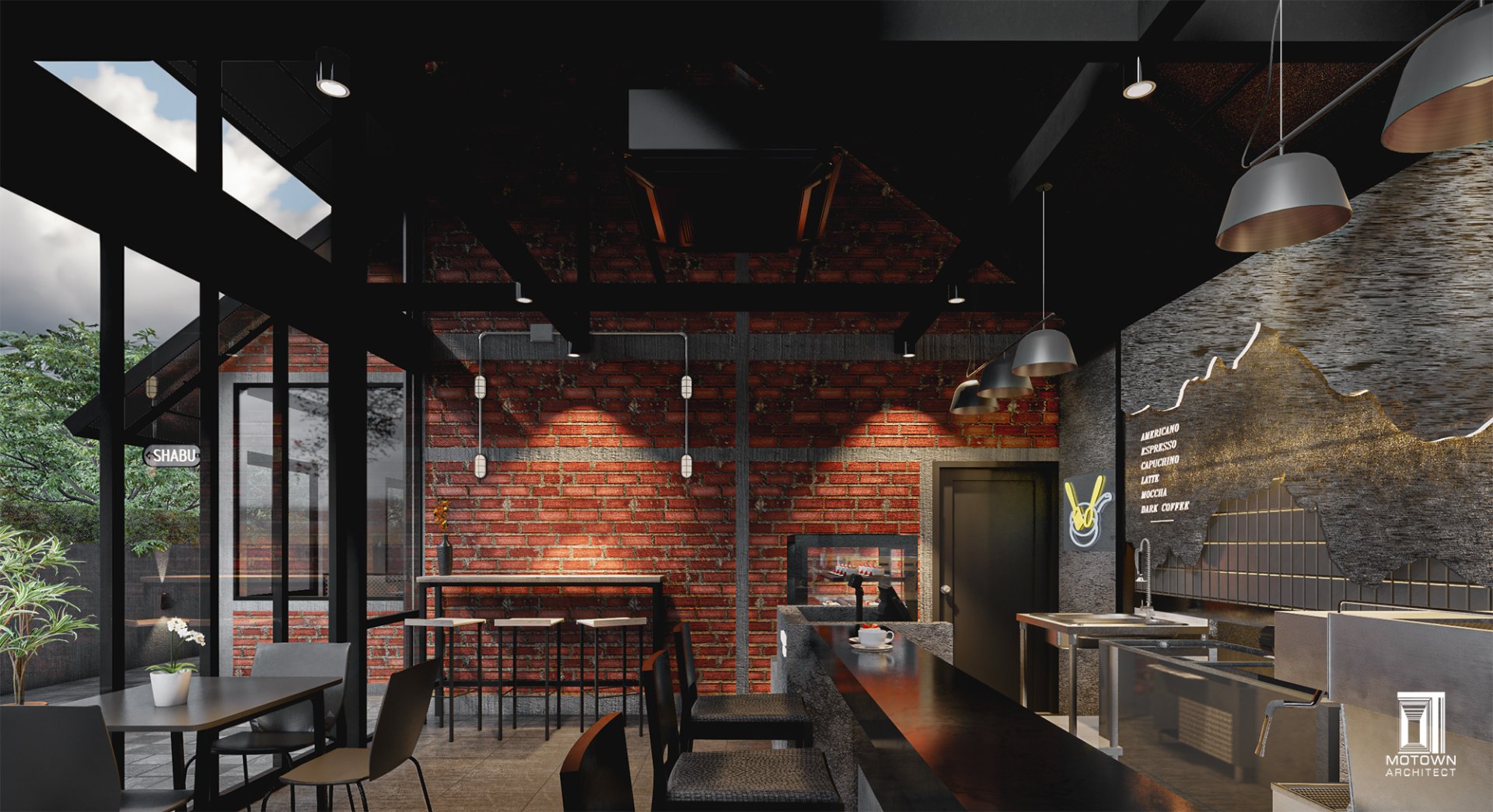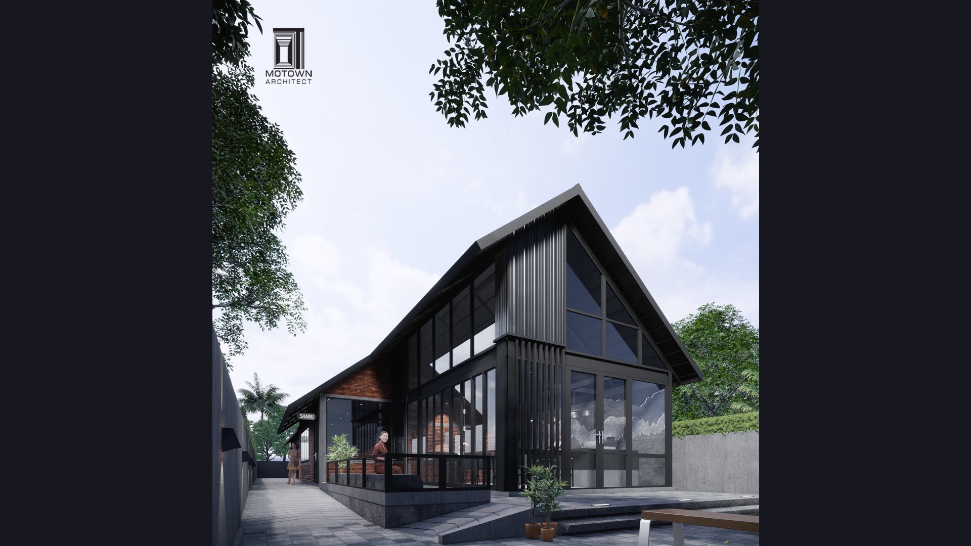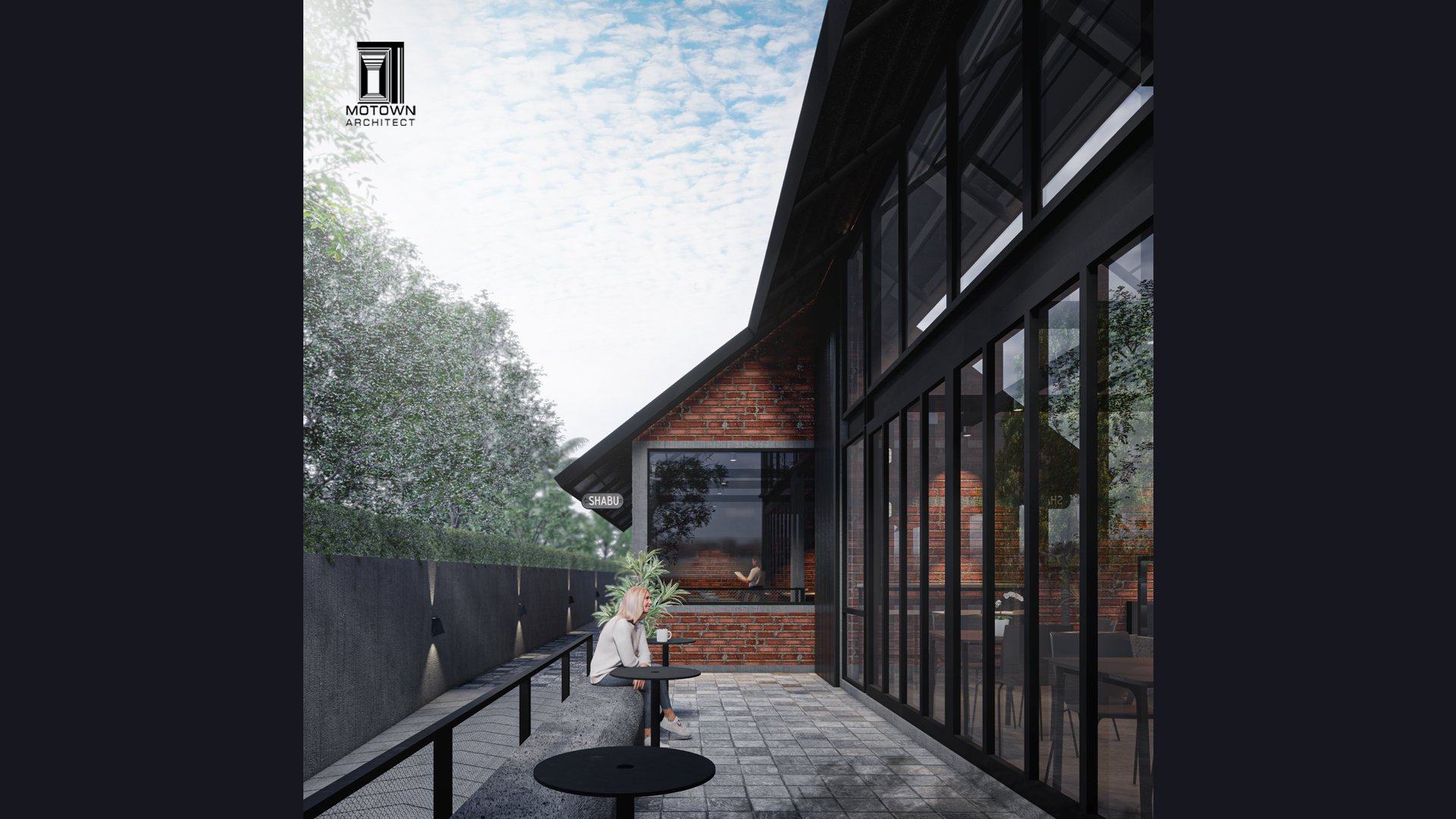 ร้านชาบูที่โดดเด่นด้วยหลังคาทรงจั่วสูง ออกแบบอาคารทอดยาวไปตามขนาดของที่ดิน ซึ่งเจ้าของตั้งใจเปิดร่วมกับคาเฟ่แต่ยังคงแบ่งสัดส่วนของกันและกันอย่างชัดเจนเพื่อง่ายต่อการบริการ เมื่อเข้ามาภายในพื้นที่จะเจอกับคาเฟ่เป็นอย่างแรก และโซนชาบูจะอยู่ถัดเข้ามาทางด้านซ้ายของคาเฟ่ ทางเข้าของทั้งสองฟังก์ชันจะแยกกันเพื่อความเป็นส่วนตัวของลูกค้าแต่ละส่วน