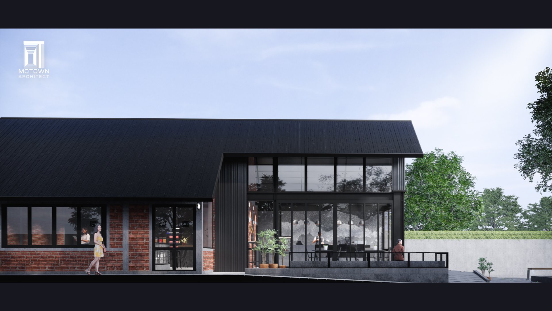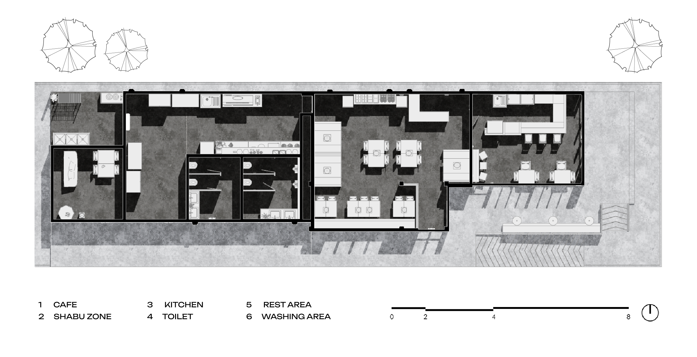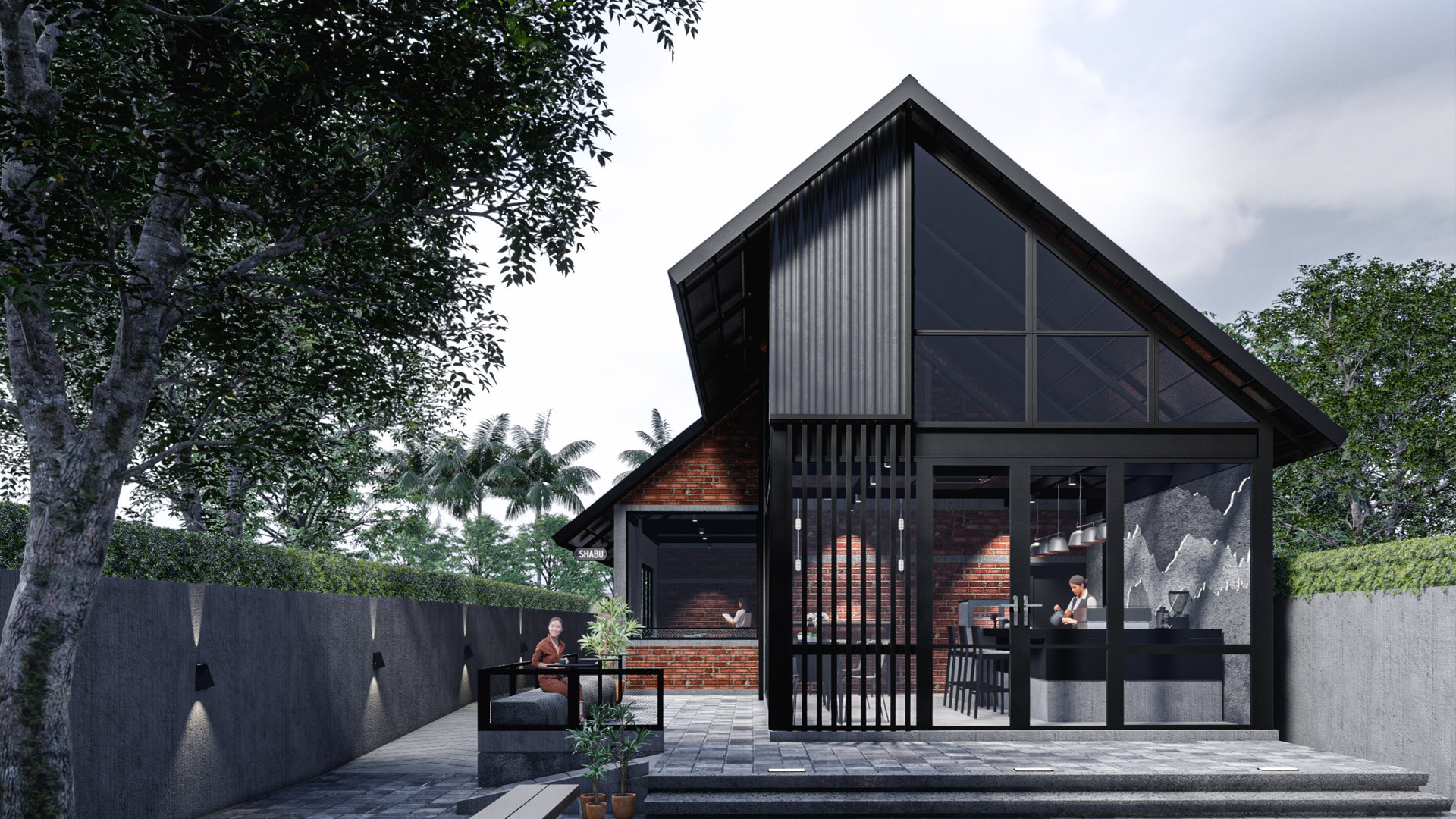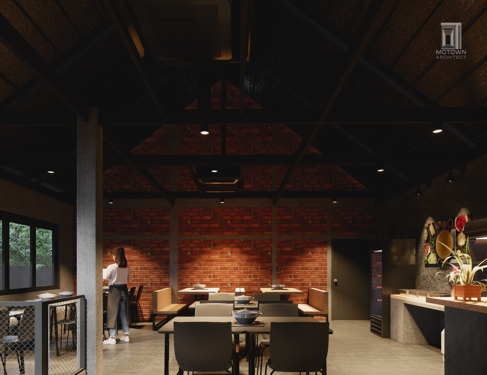 ร้านชาบูที่โดดเด่นด้วยหลังคาทรงจั่วสูง ออกแบบอาคารทอดยาวไปตามขนาดของที่ดิน ซึ่งเจ้าของตั้งใจเปิดร่วมกับคาเฟ่แต่ยังคงแบ่งสัดส่วนของกันและกันอย่างชัดเจนเพื่อง่ายต่อการบริการ เมื่อเข้ามาภายในพื้นที่จะเจอกับคาเฟ่เป็นอย่างแรก และโซนชาบูจะอยู่ถัดเข้ามาทางด้านซ้ายของคาเฟ่ ทางเข้าของทั้งสองฟังก์ชันจะแยกกันเพื่อความเป็นส่วนตัวของลูกค้าแต่ละส่วน