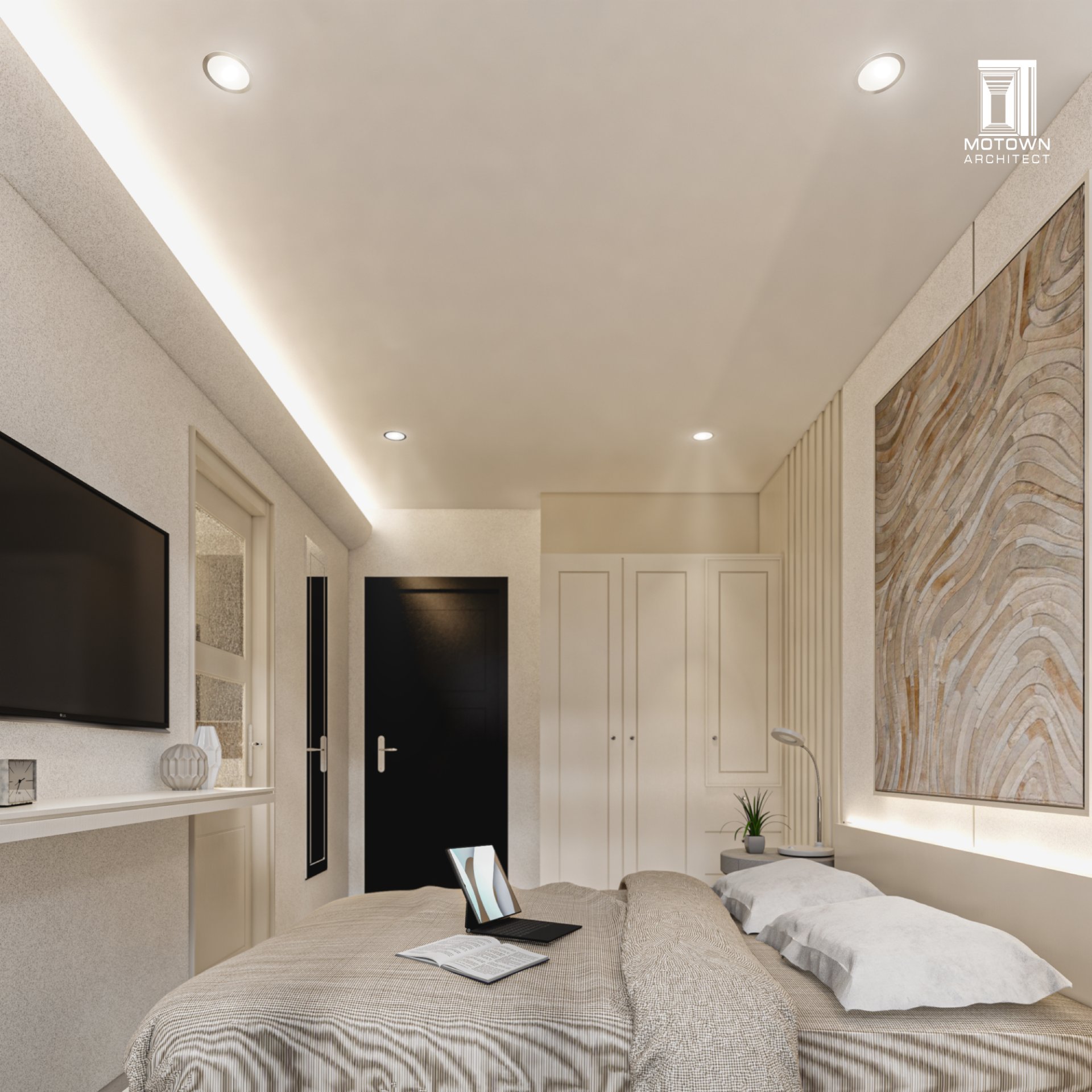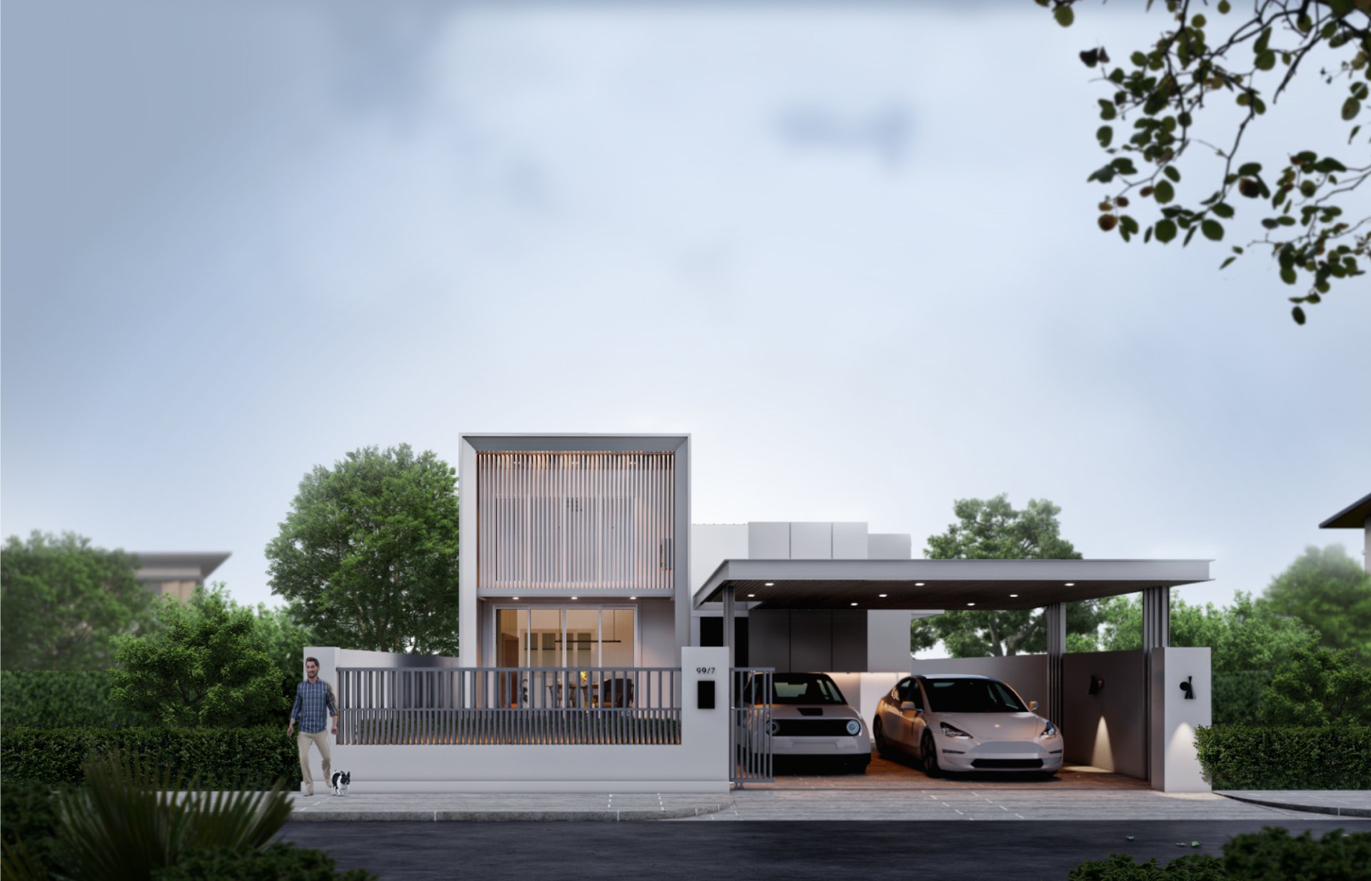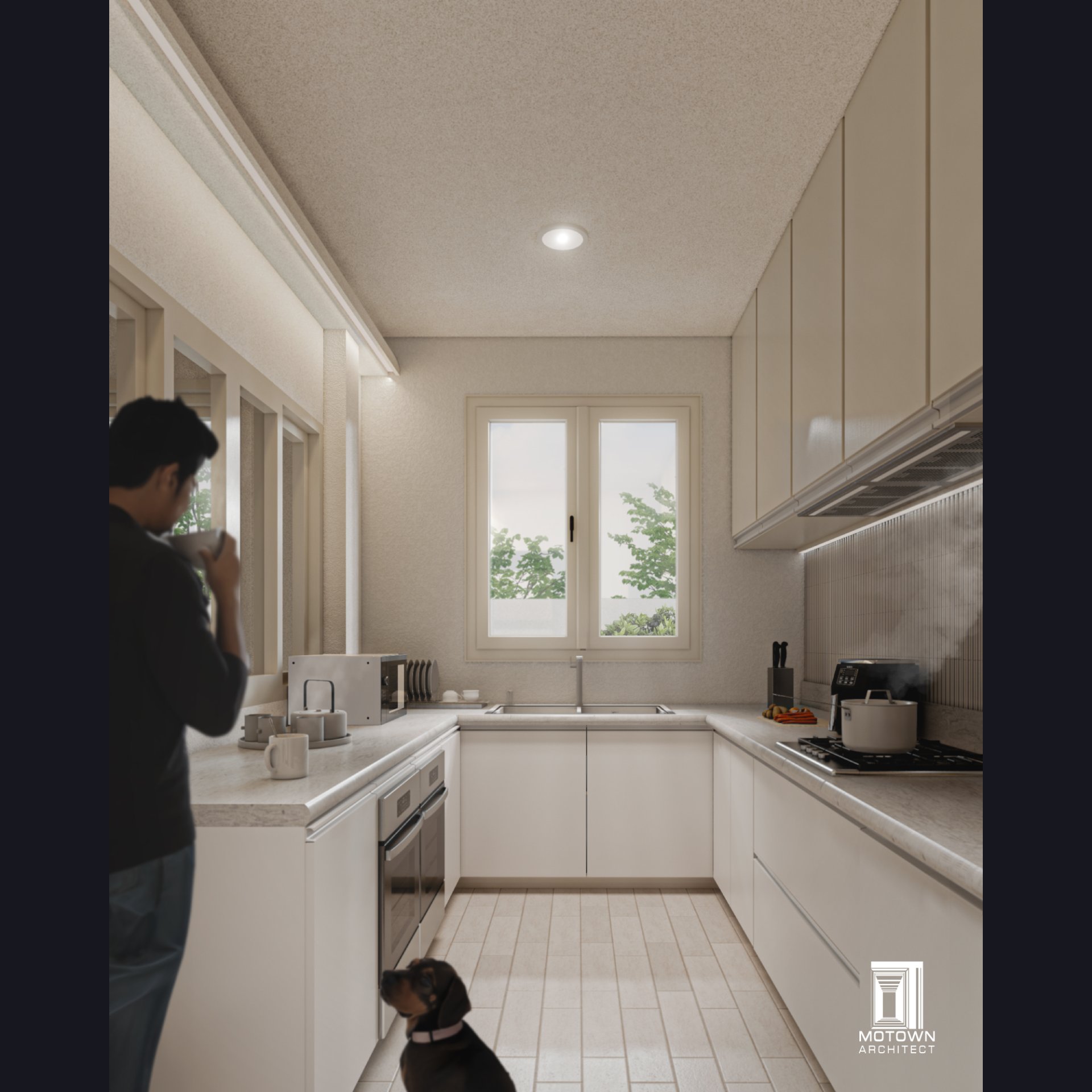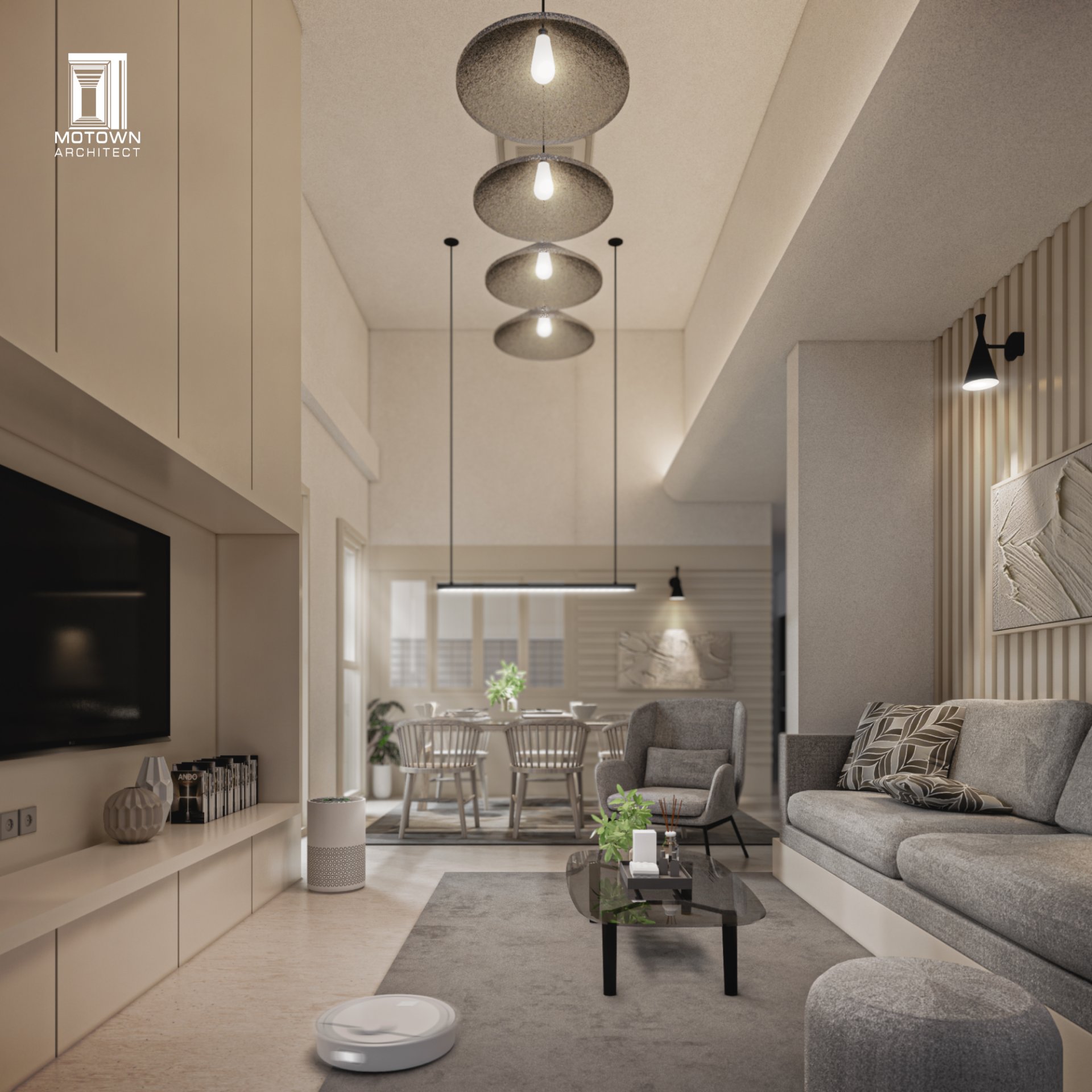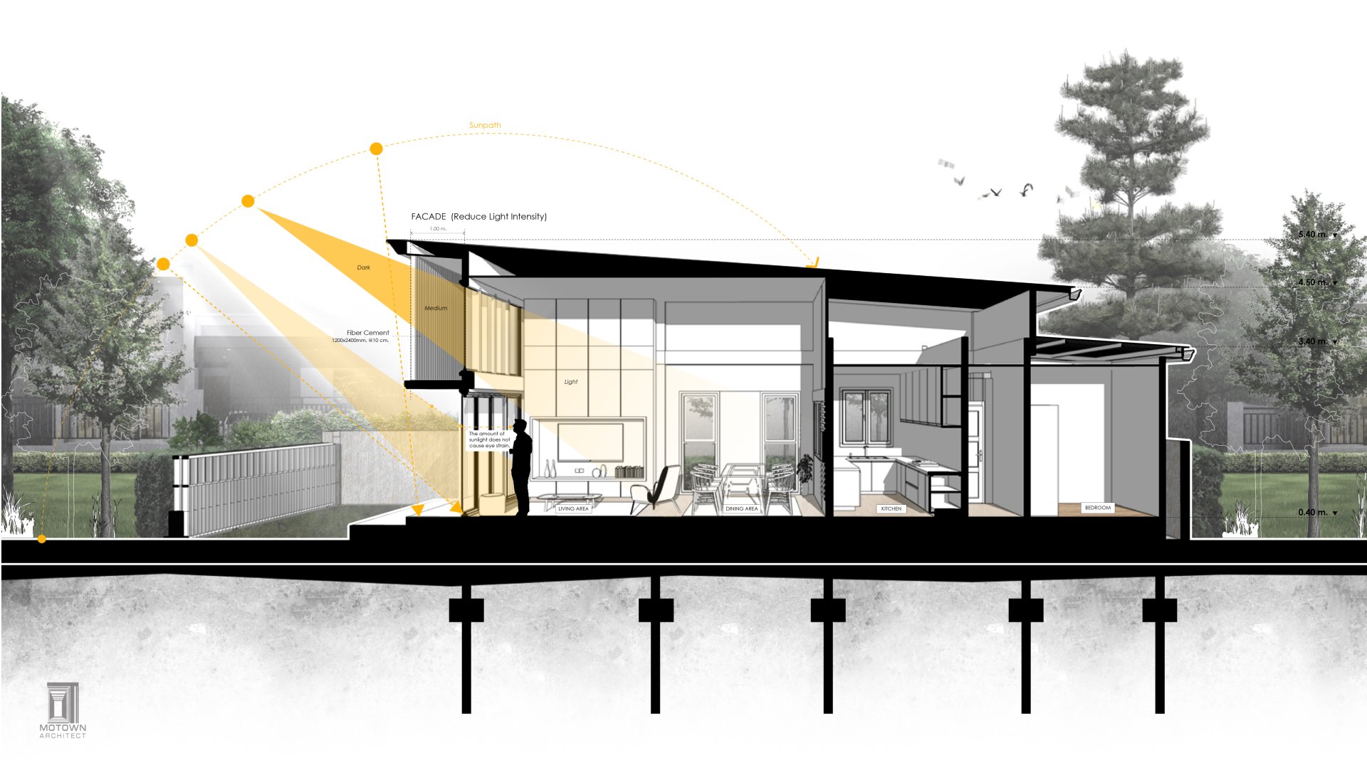 บ้านชั้นเดียวบนที่ดินจำกัด โดยรอบๆ บ้านมีอาคารล้อมอยู่ทั้ง 4 ด้าน ทำให้ต้องการความเป็นส่วนตัว รวมถึงพื้นที่ที่ปลอดโปร่ง อยู่สบาย และออกแบบให้ทุกฟังก์ชันมีขนาดกระทัดรัดเพียงพอต่อการใช้งาน