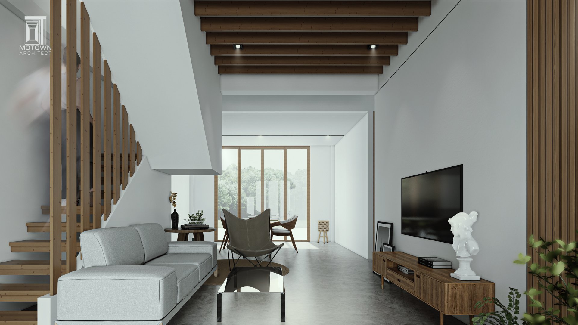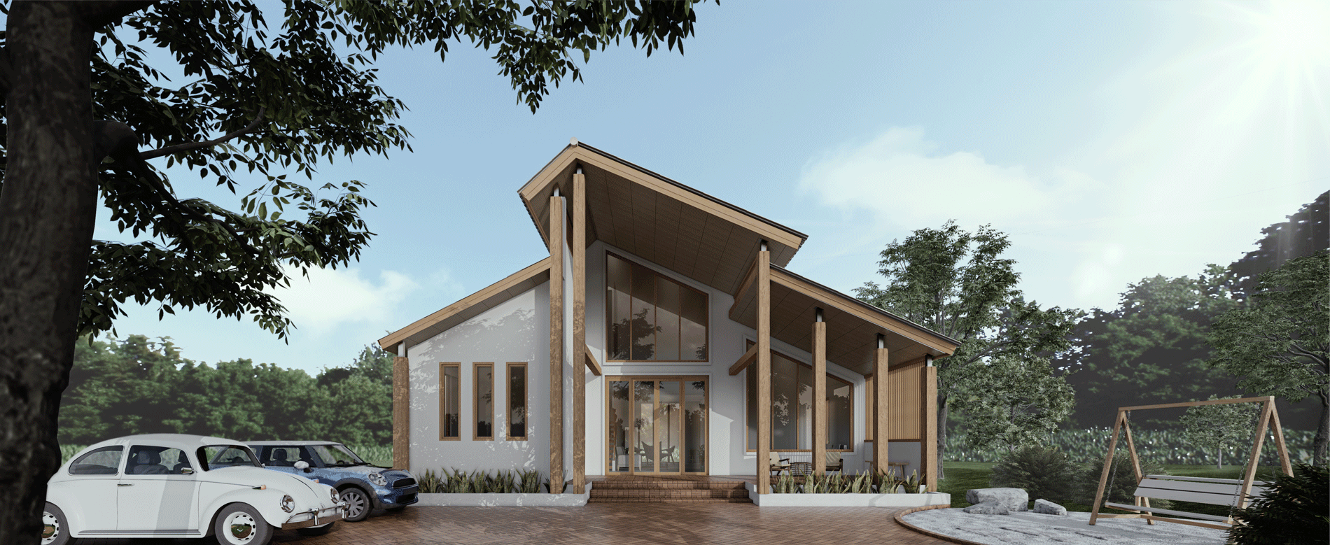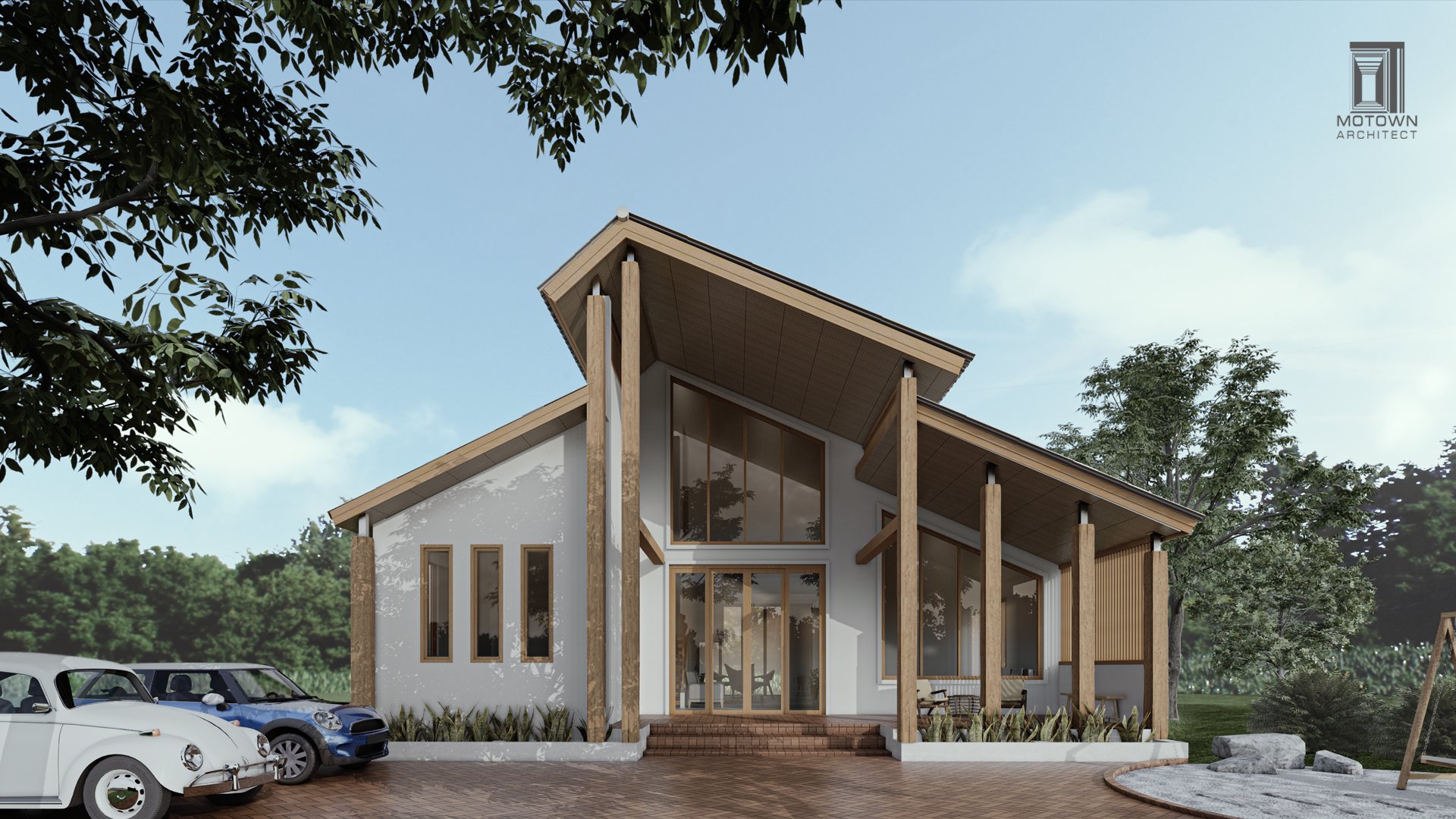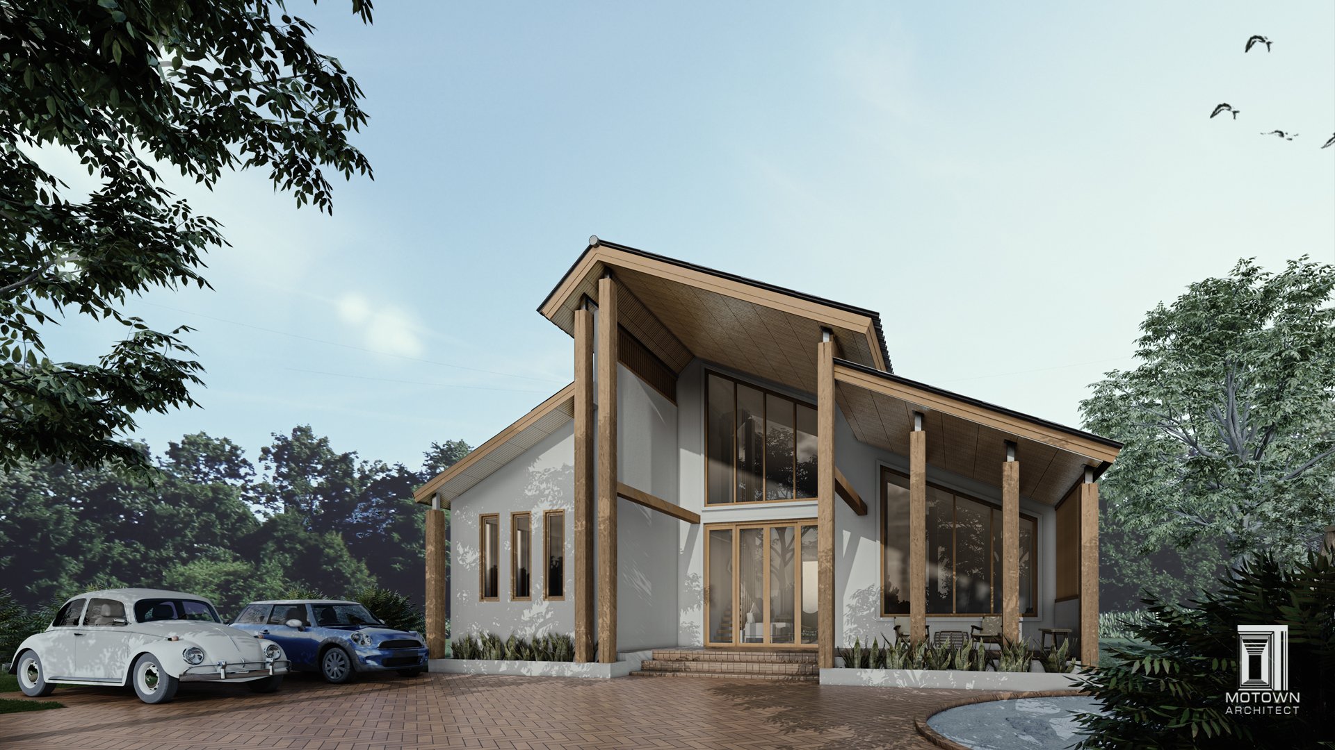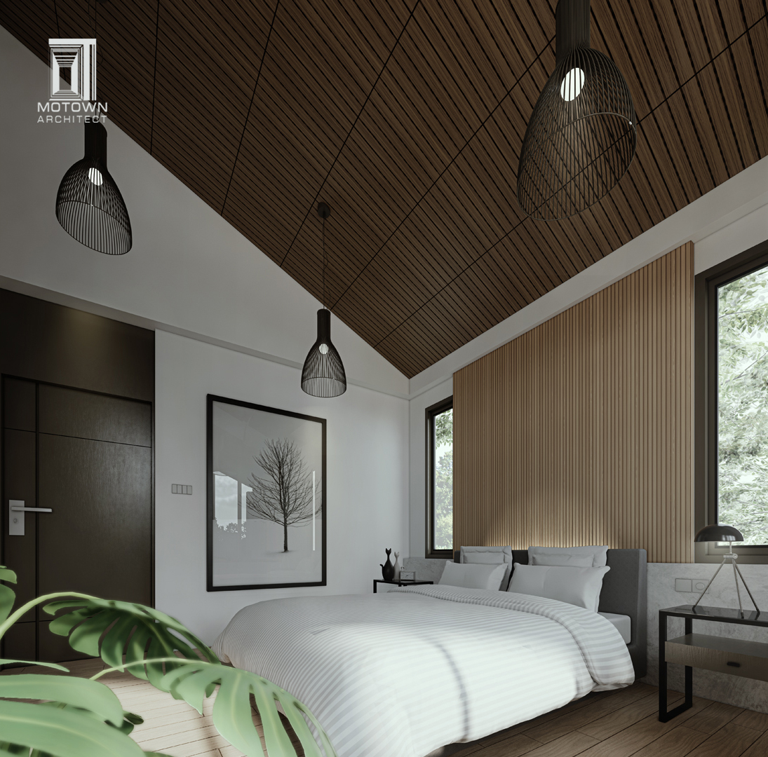 ตัวบ้านออกแบบเป็นสไตล์ Modern tropical ที่ใช้งานไม้เข้ามาเป็นหนึ่งในวัสดุหลัก นอกจากปูนที่ใช้ก่อผนังในโครงสร้างพื้นฐานแล้ว ส่วนอื่นๆ ของตัวบ้านก็ใช้ไม้เกือบทั้งหมด